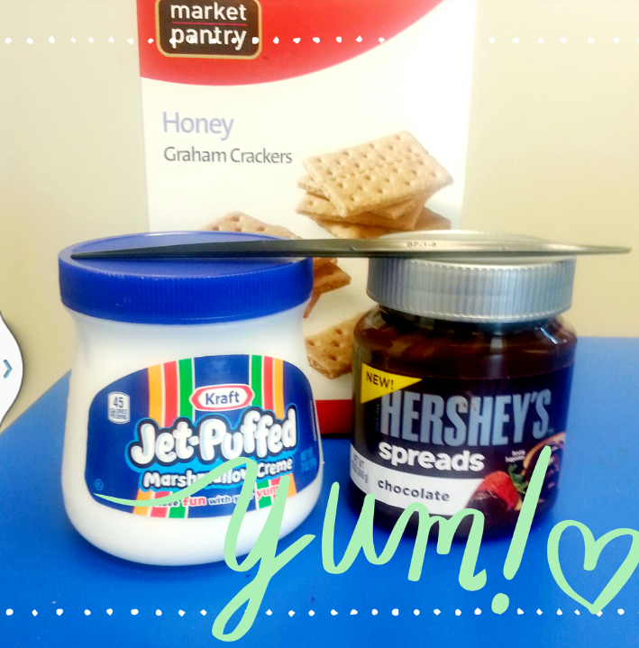 Since we couldn’t use a real campfire (or a microwave, for that matter), we made these indoor s’mores from Pre-K Pages (it’s a great, very simple 3-step visual to use with younger kids and students who are just beginning to learn the concept of sequencing) using graham crackers, chocolate spread, and marshmallow fluff. I used this activity to work on concepts and sequencing (top, middle, bottom, first, last).