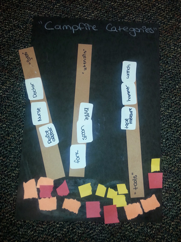The last thing we did was make these little campfire crafts for artic words and for categories. Jenn’s sand castle craft was the inspiration for the fire one on the right! (although it’s not complete– I forgot to take a picture after day 2 when the student finished it with more “flames.”) My love of s’mores was the inspiration for the marshmallow categories on the left 🙂 Each stick represented a category and they had to name items in that category to get marshmallows to “roast” in their fire.