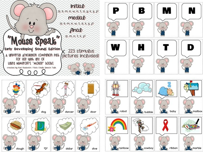 Last Spring, I made a universal articulation companion pack to go along with all the “If You Give A Mouse/If You Take A Mouse” books. It features all of the earlier-developing sounds in all positions of words & can be used with any of the Laura Numeroff “Mouse” books (or any other cute Mouse book, such as “Mouse Paint”). Sounds /p, b, m, n, w, h, t, d, y, k, g, f/ are included.
