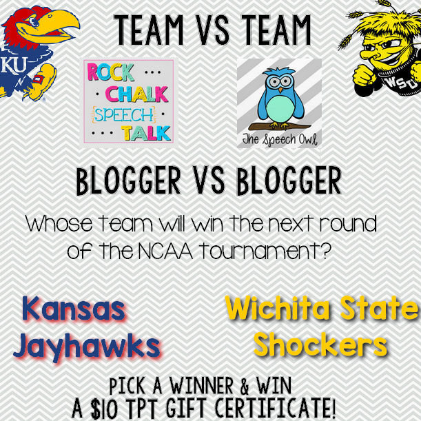 This year, two Kansas teams are in the same bracket division in the NCAA tournament– the Jayhawks & the Wichita State Shockers. While I’m a Jayhawk fan, a fellow SLP blogger, Elizabeth over at The Speech Owl, is a WSU Shockers fan, and our teams are playing against each other this Sunday, 3/22! We thought it’d be fun to get our blog followers in on the March Madness!