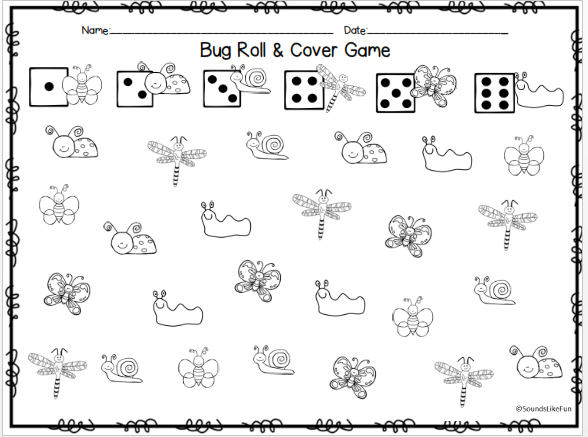 This activity is played like Simon Says, but “Queen Bee” says directions instead of Simon 🙂  This activity can be easily adapted to be more simple, and played without the “Simon Says” component to just work on spatial concepts (Put the bee below the jar;  Put the dragonfly in the jar), but if you need to add a twist to make it a little more challenging, “Queen Bee says” is where it’s at 🙂  I liked that there was just 1 page of bugs to cut out and the jars were just in easy rectangles for cutting out.  Hardly any prep time involved!