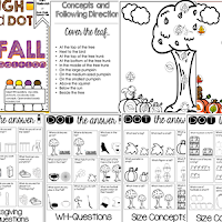 Fun fact #1:  Little kids love dot markers.  Especially the “extra juicy” ones that give out a lot of paint without a lot of pressure.  I mean, I guess if I were in preschool and could make a lot of mess with very little effort, I’d probably be happy, too.  Fun fact #2:  Little kids don’t ever get tired of playdough. Ever.  EVER!  This packet includes dot marker pages for Fall/Thanksgiving WH questions and basic concepts, and playdough pages for -ing verbs/pronouns/’be’ verbs, vocabulary, and open-ended pages.  I stick the playdough pages into 3 ring page protectors so I don’t have any prep work involved!
