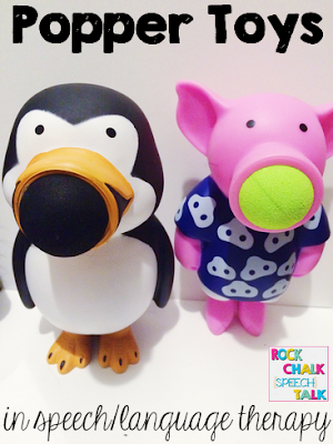 You guys. How have I gone so long without popper toys in therapy?! I am in love with the pig and penguin poppers I got for Christmas, and so are my students. We had to set some ground rules at first– you know, things like “We don’t aim the ball at teachers or our friends” and discussions of, “No, the animals are not “farting” or “pooping” but are just blowing out of their mouth.” (Sigh.. little boys and their early obsessions with bodily functions.. ha ha). Once the ground rules were set, though, the poppers have been a HUGE hit in therapy over the last few weeks!