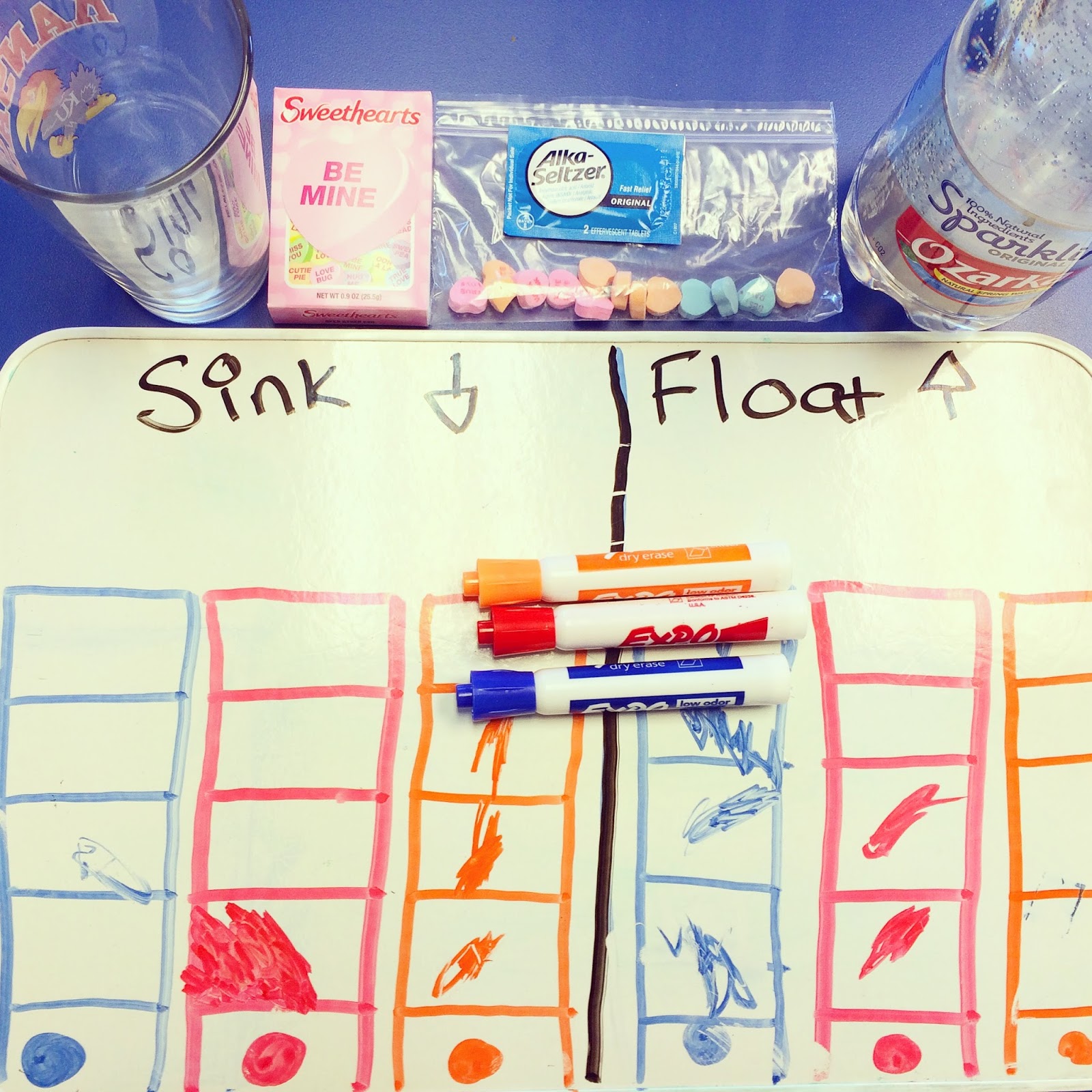 For my in-class small group rotations, I did a science experiment called “Dancing Hearts” that uses the conversation candy hearts. I followed instructions from Playdough to Plato’s post, using a glass, candy hearts, alka seltzer, and sparkling water. The combination of Alka Seltzer and sparkling water creates gas bubbles that make the hearts float up and then sink back down when the gas bubbles pop. The bubbles are constantly forming and popping, so it looks like the hearts are “dancing” as they move up and down.