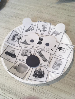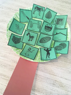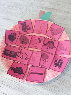 Print any set of cards (two syllable words from my phonology set are featured in this one) on red, green, or yellow paper, and glue all around the plate! You can also have your kids color the plate with a crayon ahead of time so the empty spaces between the pictures are the same color as the pictures, too.  Add the stem and leaf, and voila!