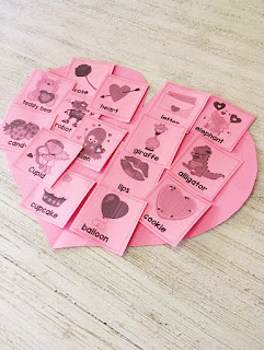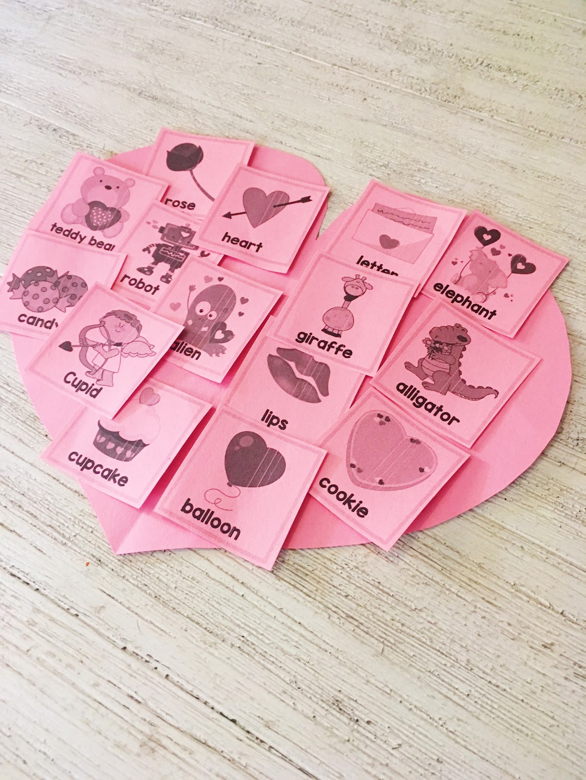 Super simple! Just cut out a heart from pink construction paper and glue on the pink pictures of your choosing (Valentine’s card set shown here)