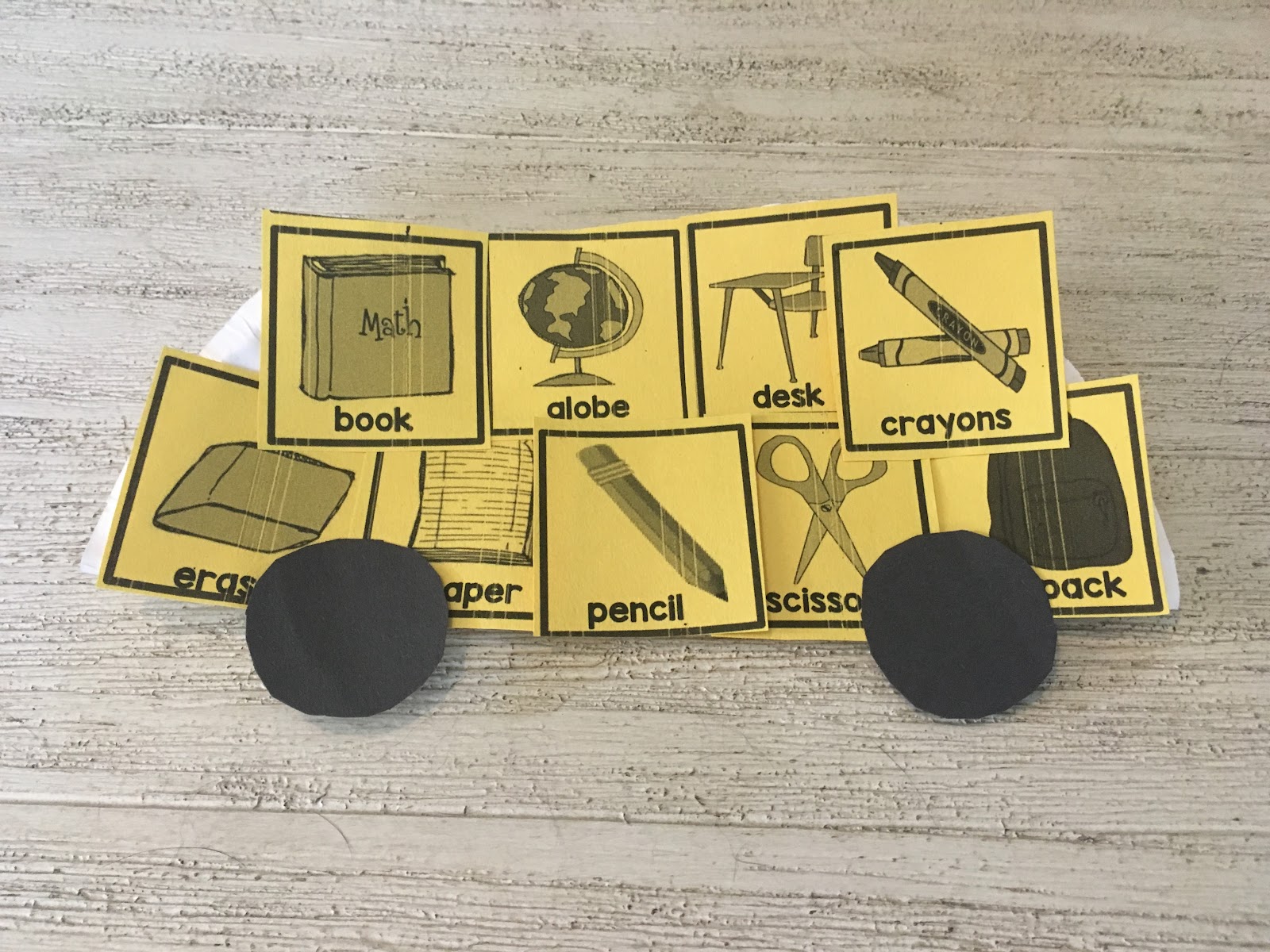 Take a paper plate and fold it in half, and glue the yellow target pictures onto the plate.  I used the “back to school” cards from my original language set, which are great for targeting school supply vocabulary and object functions.  I used 4 wheels per bus since I was using the front and back.  I also cut off the top rounded part of the plate when I was done, to have a flat edge at the top.