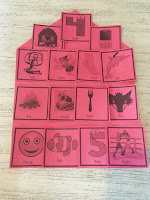You may have seen this craft previously posted on my Instagram page, but I love it! I took a paper plate, folded it in half, and cut out the middle circle.  I printed the target pictures (in this instance, Christmas vocab cards) on green paper, and printed a black/white image of a bow onto red paper.  Glue the green pictures all around the plate edges, and glue the red bow at the bottom when you’re done!