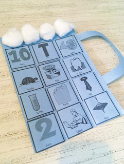 This one is great to use at any point in Winter! I cut out a large rectangle from blue construction paper as the base of the mug, and then cut out a skinny half circle for the handle to glue onto the side.  Glue on the blue pictures (initial /t/ cards for ‘backing’ featured) that you printed either on blue construction paper or copy paper, and then glue the cotton balls at the top for the whipped cream.