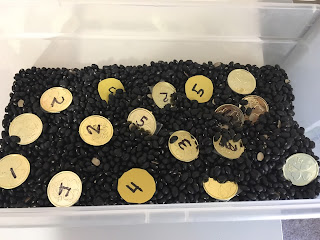 Sidenote: If you are transporting your sensory bin in a vehicle, make sure it’s in a bin with a lid. I made this novice mistake, and when someone cut me off and I had to slam on my brakes, my bin FULL of beans went flying EV-ER-Y-WHERE! I’m still finding beans randomly in my car! When I took my car in for an oil change to Jiffy Lube recently, I felt like I should explain to the mechanics why they might find randomly find beans while they were vacuuming the inside of my car.. ha. #totallynormal #slpproblems