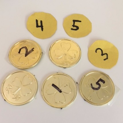 I bought the gold coins from Michaels around St. Patty’s Day one year, but you can find some at your local party supply store (like Party City) or on Amazon (note: the link is an add-on item, but I’m sure you can find something else you need to purchase on Amazon!).  I put scotch tape on the gold coins and wrote numbers 1-5 with a sharpie on the tape, so I could take the numbers off and reuse the coins for other purposes if I so desired.  No- cost alternative: Cut out some “coins” with yellow construction paper– super easy, but even easier with a circle die-cut, or the craft circle punchers if you have one!