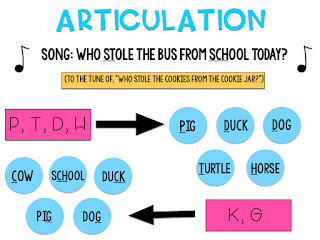 You can target a mix of earlier-emerging sounds /p, t, d, h, k g/ just by naming the farm animals as you sing the song, “Who stole the bus from school today?” “Pig!”  “Pig stole the bus from school today….” etc…