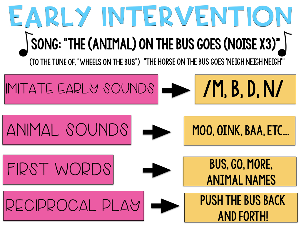 You can target a mix of earlier-emerging sounds /p, t, d, h, k g/ just by naming the farm animals as you sing the song, “Who stole the bus from school today?” “Pig!”  “Pig stole the bus from school today….” etc…