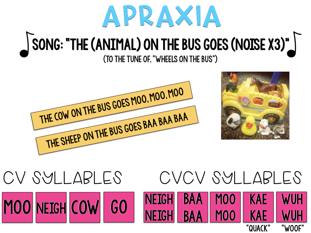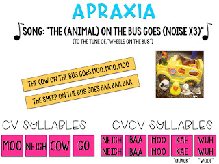 These materials are great for working on CV and CVCV syllables with your kids with Apraxia using mostly the animal sounds.  We sang about the farm animals and their sounds to the tune of Wheels on the Bus, and pushed the bus back and forth to each other!