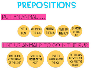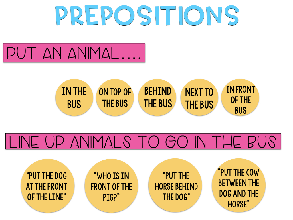 Have students working on prepositions? Have them place the animals in different places on/around the bus, or have the animals form a line to get on the bus and have your student place each animal in front of/between/behind another animal.